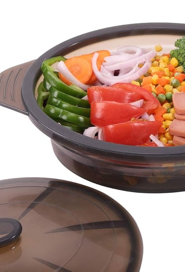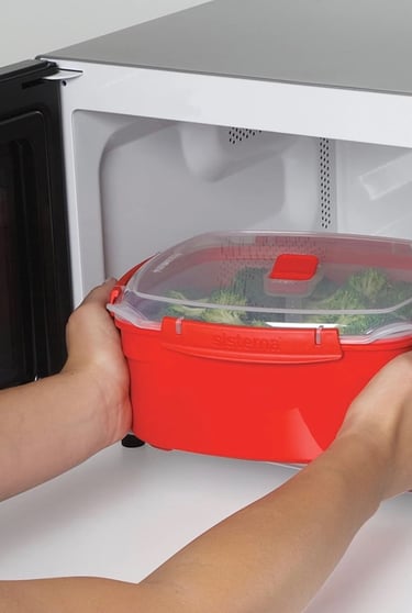 Versatile microwave steaming device for cooking nutritious vegetables, fish, and dumplings in minutes perfectly.