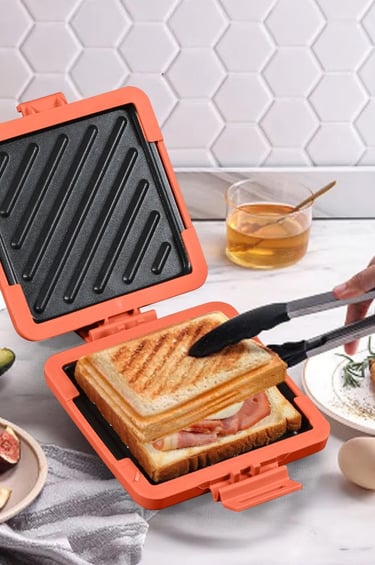 Innovative grilling device creating crispy grilled cheese sandwiches using only standard microwave heat technology perfectly.