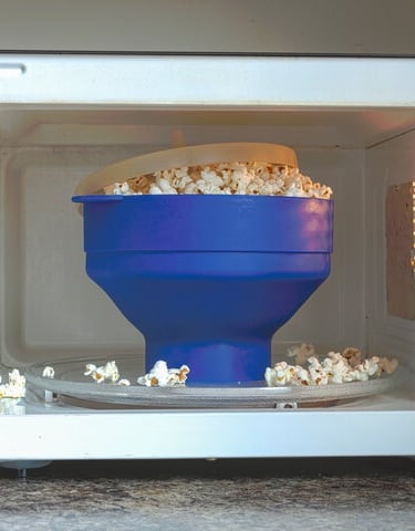 Collapsible silicone bowl creating perfect microwave popcorn for social gatherings and late-night movie sessions.